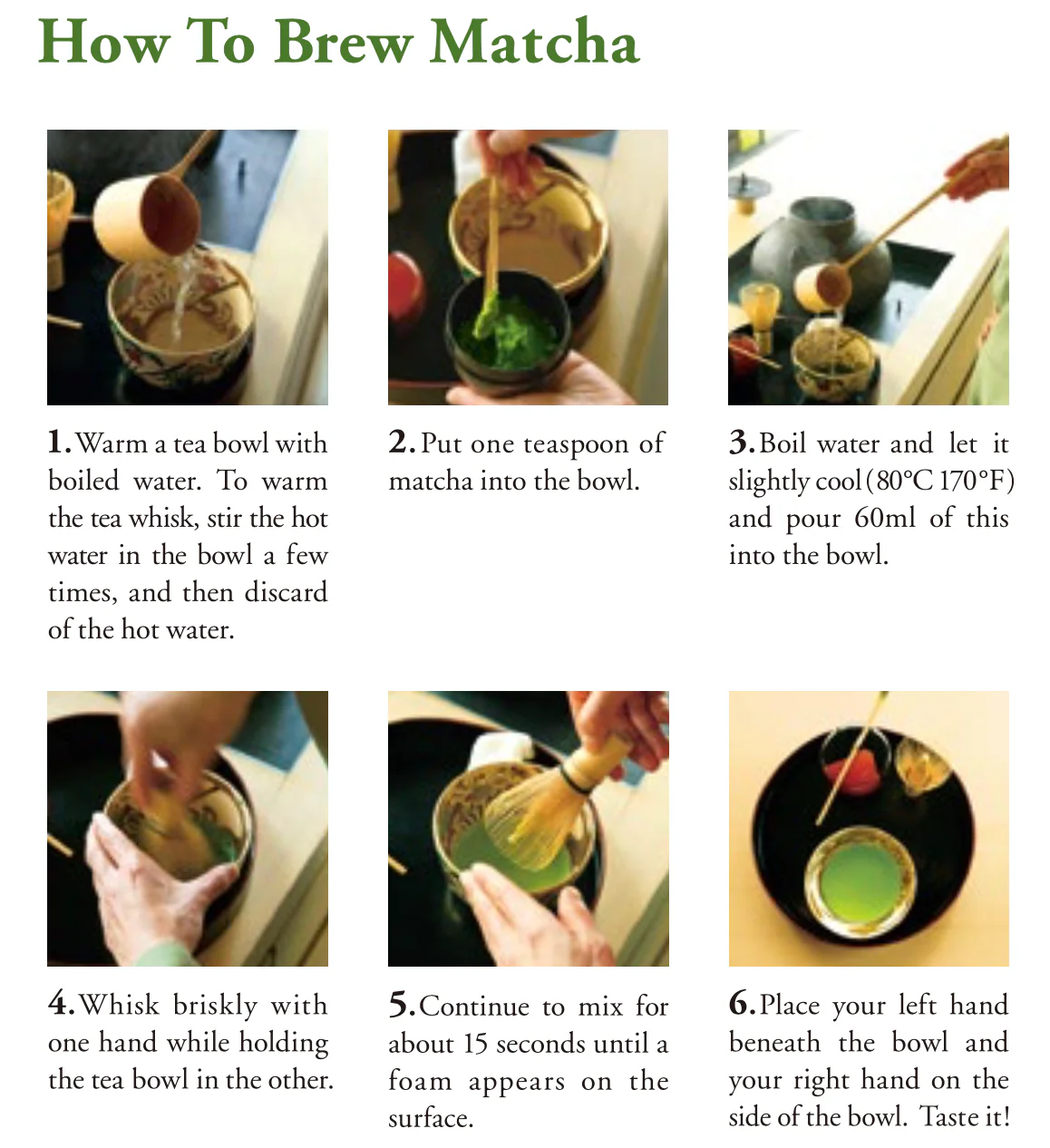 How to brew Matcha- Place 1 1/2 teaspoons of Matcha Powder in a tea bowl