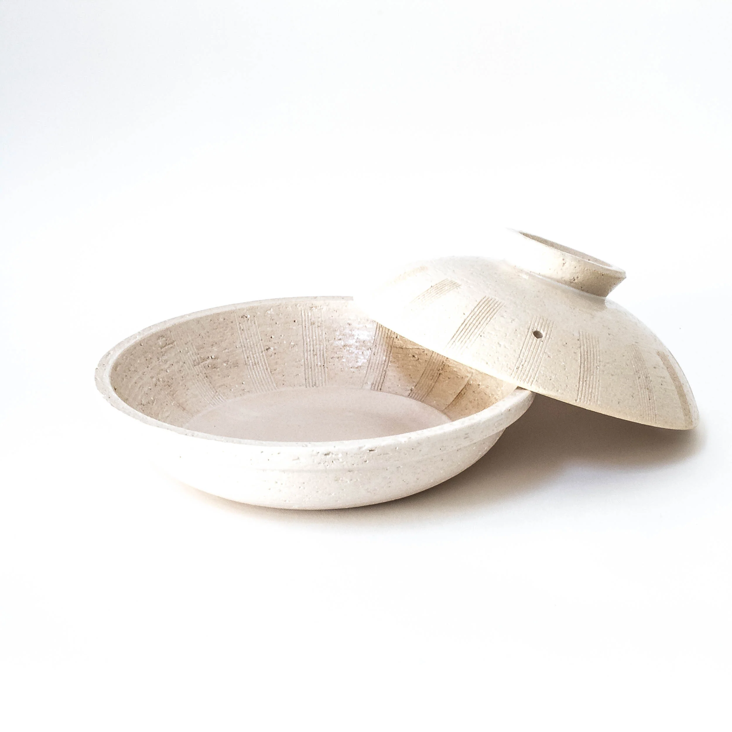 The name Shiro-Kushime translates into "white comb teeth patterns". Both the lid and the inside of the bowl have hand-carved comb teeth patterns which bring both elegant and rustic looks.