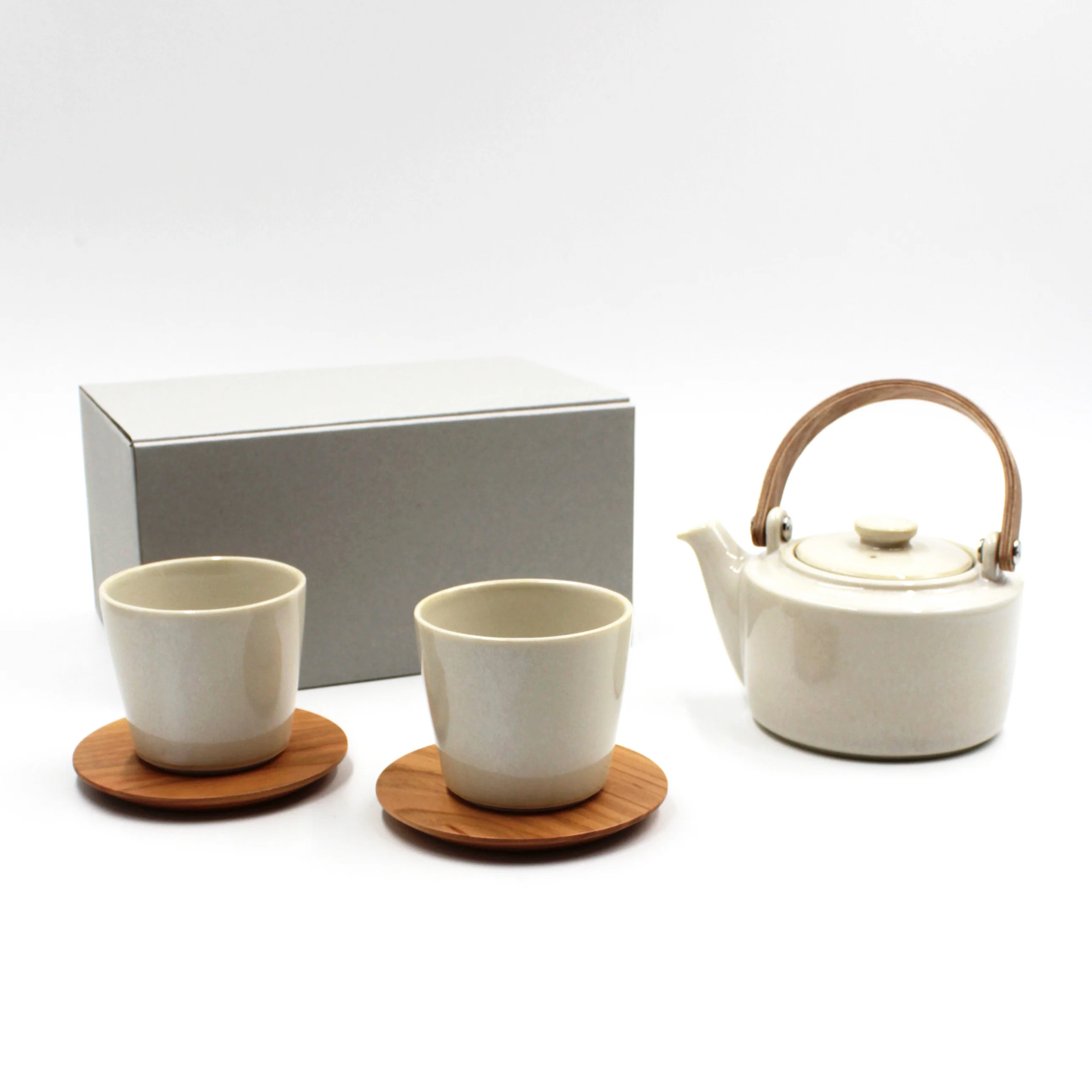 Included in the set are a wooden handle Dobin (ceramic pot), two ceramic Tea Cups, and two Yamazakura (Japanese Cherry Wood) Tea Coasters.